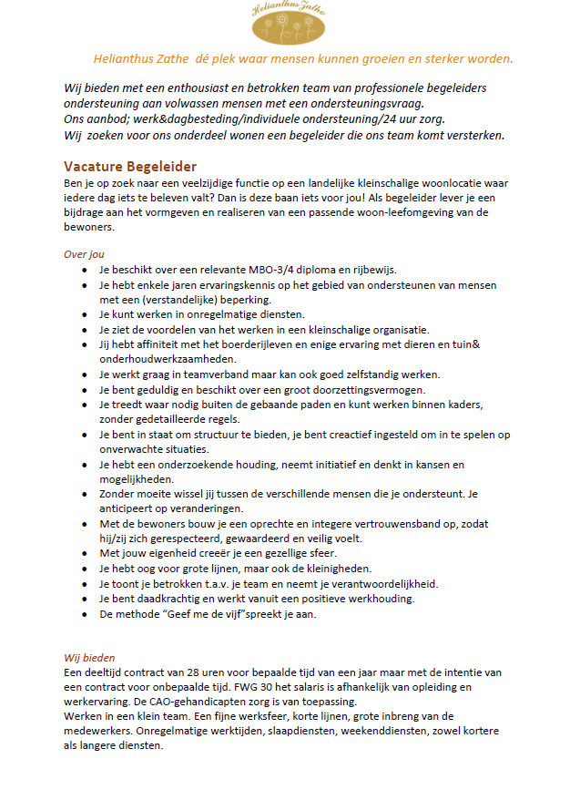 Ben je geïnteresseerd in deze veelzijdige functie en voldoe je aan ons profiel stuur dan je sollicitatie en CV uiterlijk 20 september a.s. naar Info@helianthuszathe.nl. Motiveer in de brief waarom jij bij Helianthus Zathe wilt werken en waarom jij geschikt bent voor deze functie. Voor donderdag 26 september worden de mensen waar we graag mee in gesprek willen uitgenodigd. We hebben de gesprekken ingepland op dinsdag 1 oktober.